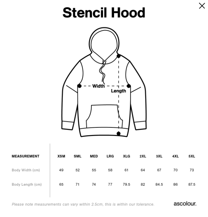 • XXS, XS, Small, Medium, Large, X Large, 2X Large, 3X Large, 4X Large, 5X Large